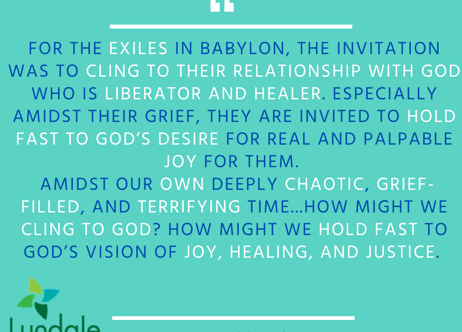 For the exiles in Babylon, the invitation was to cling to their relationship with God who is liberator and healer. Especially amidst their grief, they are invited to hold fast to God’s desire for real and palpable joy for them.